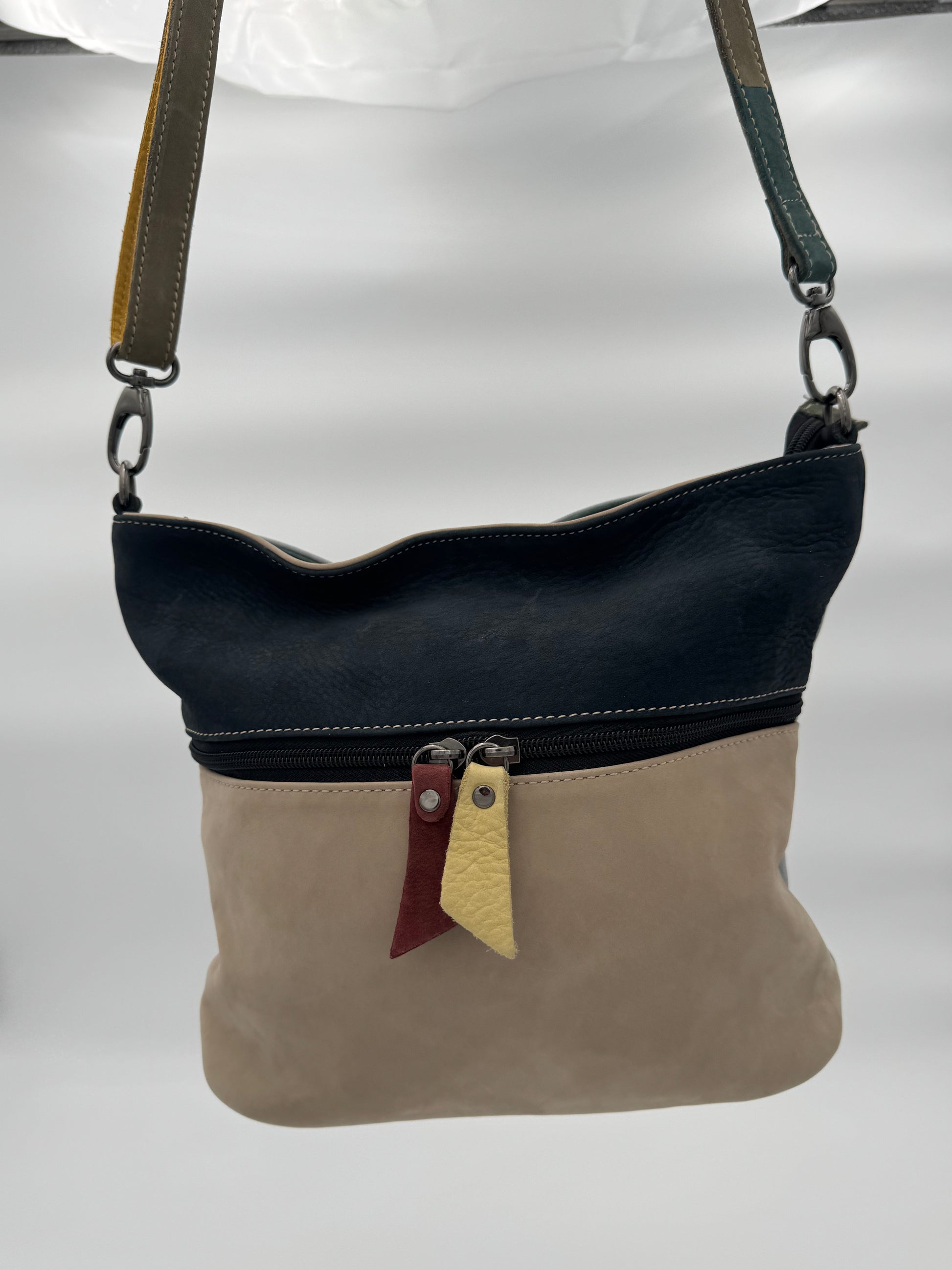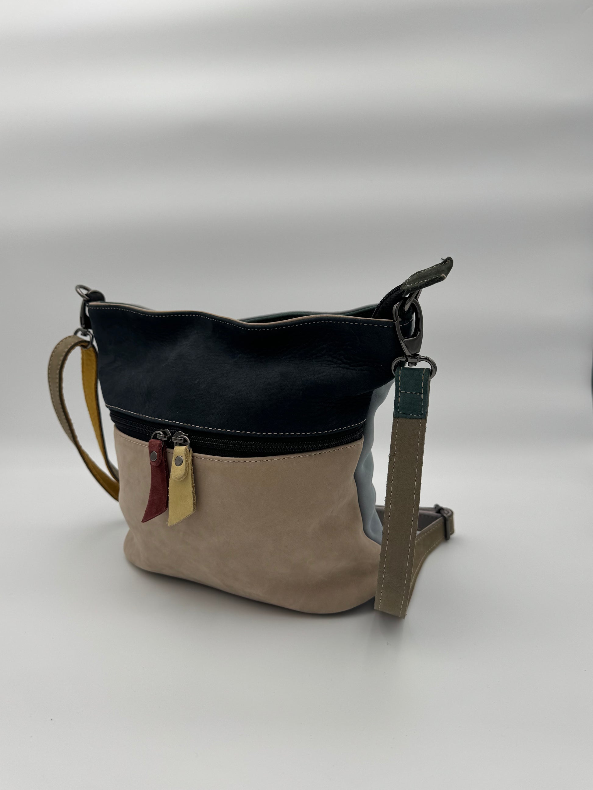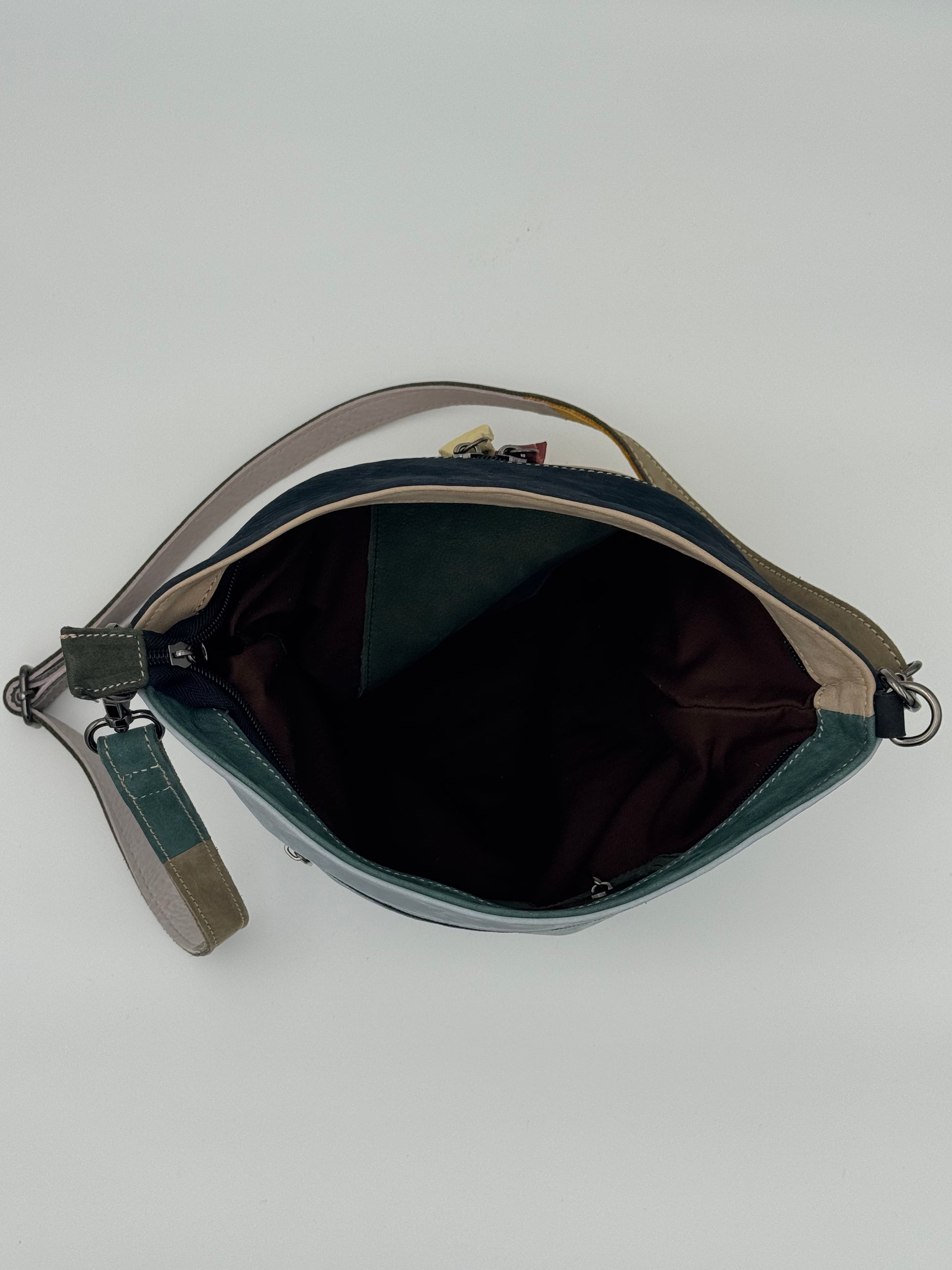Borsa in pelle tinta unita basic e patch, tracolla allungabile in pelle rimovibile, chiusura esterna con zip, tra tasche interne.